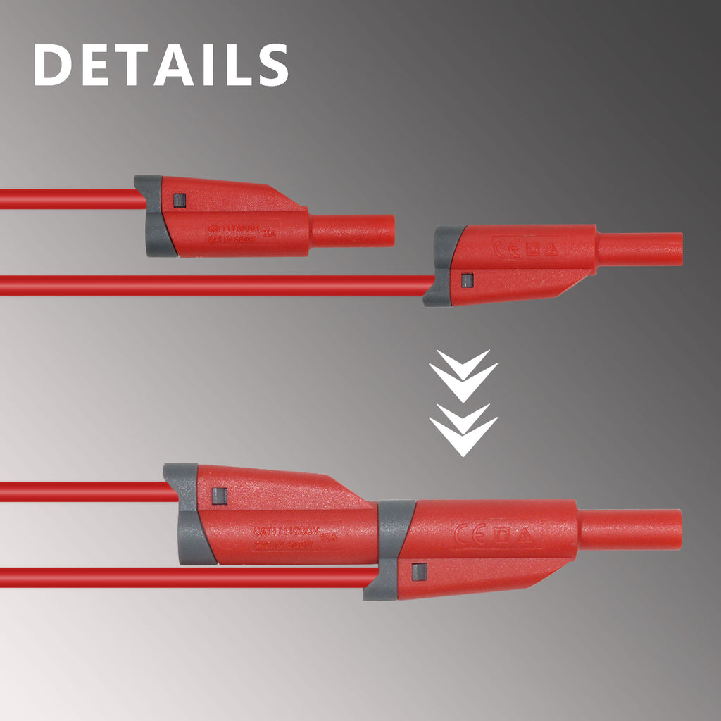⚡Both ends of the test leads are stackable 4mm standard banana plugs. You can plug more than one banana plug into the same banana socket. Lead length: 3.3ft.